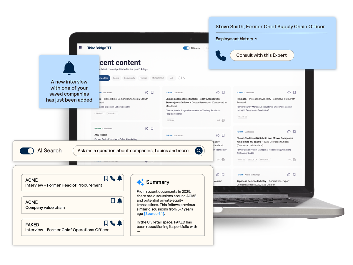 Third Bridge의 라이브러리는 깊이와 품질 모두 인상적이며, 1:1 전문가 통화 프로세스는 탁월했습니다. 목표 기업의 전직 고위 임원과 신속히 연결되어 핵심 실사 질문에 대한 답변을 얻을 수 있었습니다. Third Bridge는 신규 프로젝트에서 항상 가장 빠른 응답 속도를 보여줍니다.