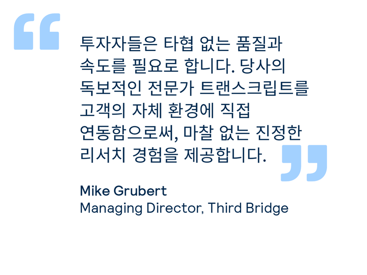 귀사의 AI 에이전트가 당사 독점 전문가 트랜스크립트를 실시간으로 활용해, 내부 워크플로우 내에서 인사이트를 검색, 요약 및 맥락화할 수 있도록 지원합니다.