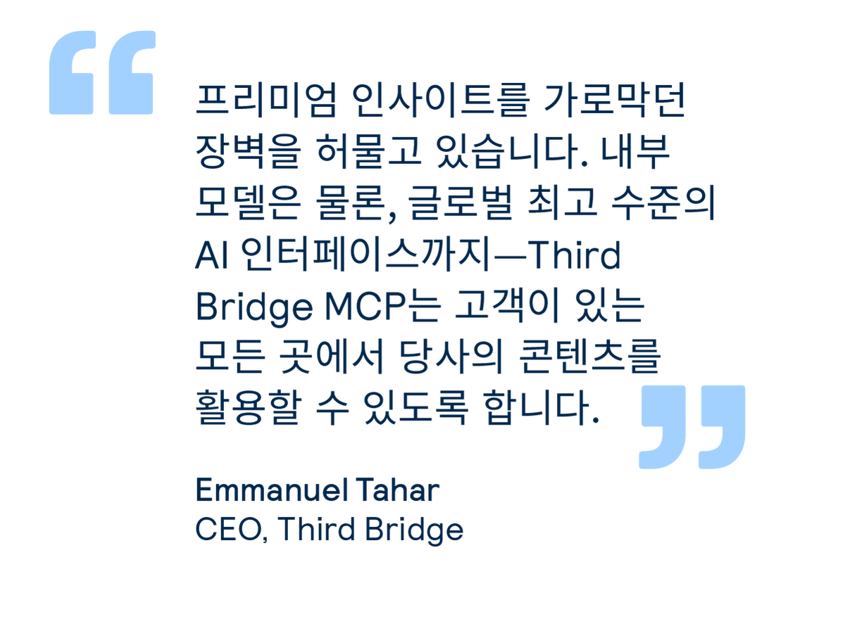 - 네이티브 AI 연결: 별도의 고비용 수동 데이터 설정이나 관리 없이, 복잡한 미들웨어나 불안정한 파이프라인을 거치지 않고 귀사의 LLM 에이전트를 Third Bridge 라이브러리에 직접 연결합니다.