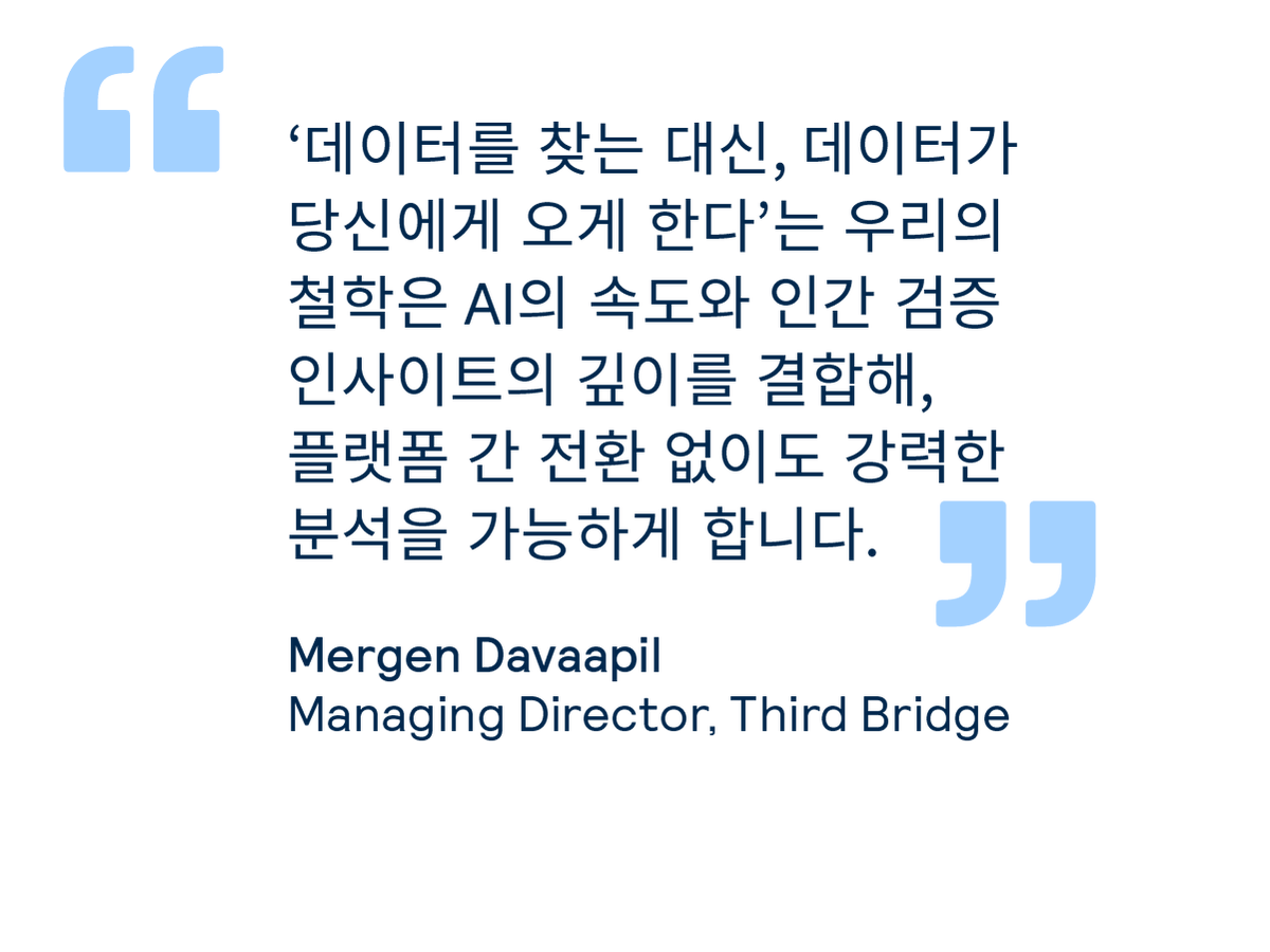 - AI 연구 플랫폼: Third Bridge의 광범위한 파트너십 생태계를 통해 전문가 인사이트에 직접 연결하고, 간단한 권한 업데이트만으로 최신 LLM에 최적화된 인사이트 피드를 즉시 활용할 수 있습니다.