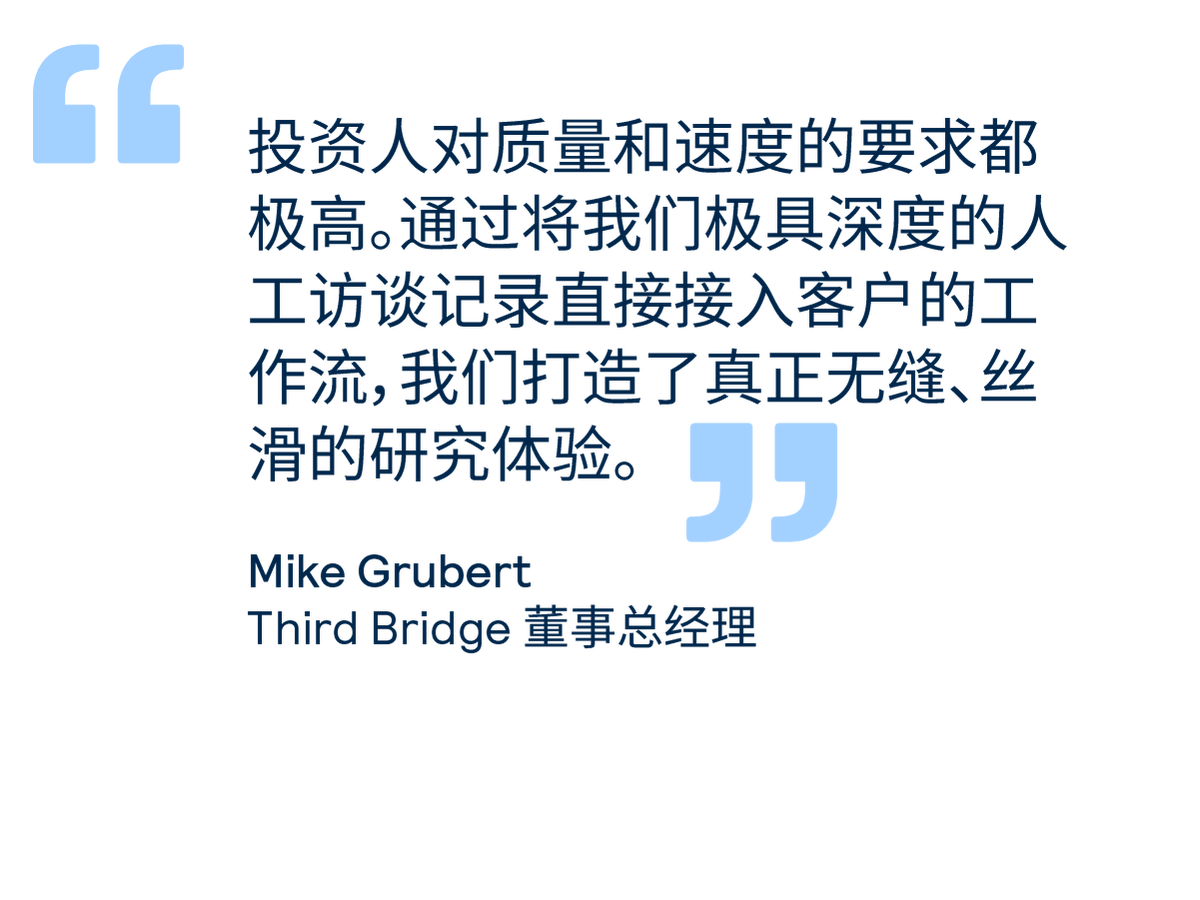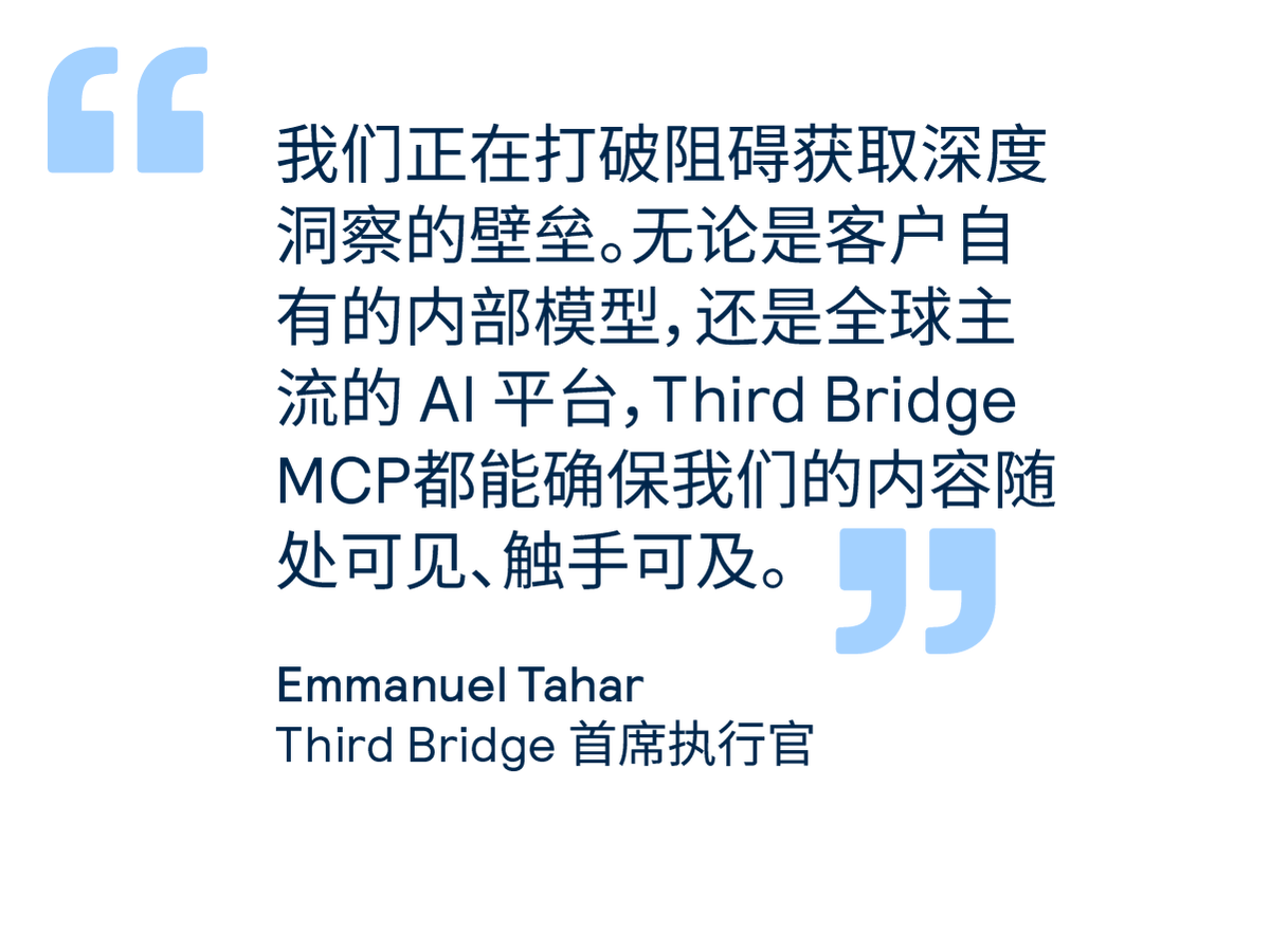 让您的AI基础架构能够与Third Bridge的专家访谈记录深度交互。通过根据指令动态检索相关的专家知识,自带上下文理解,随时响应您的需求。