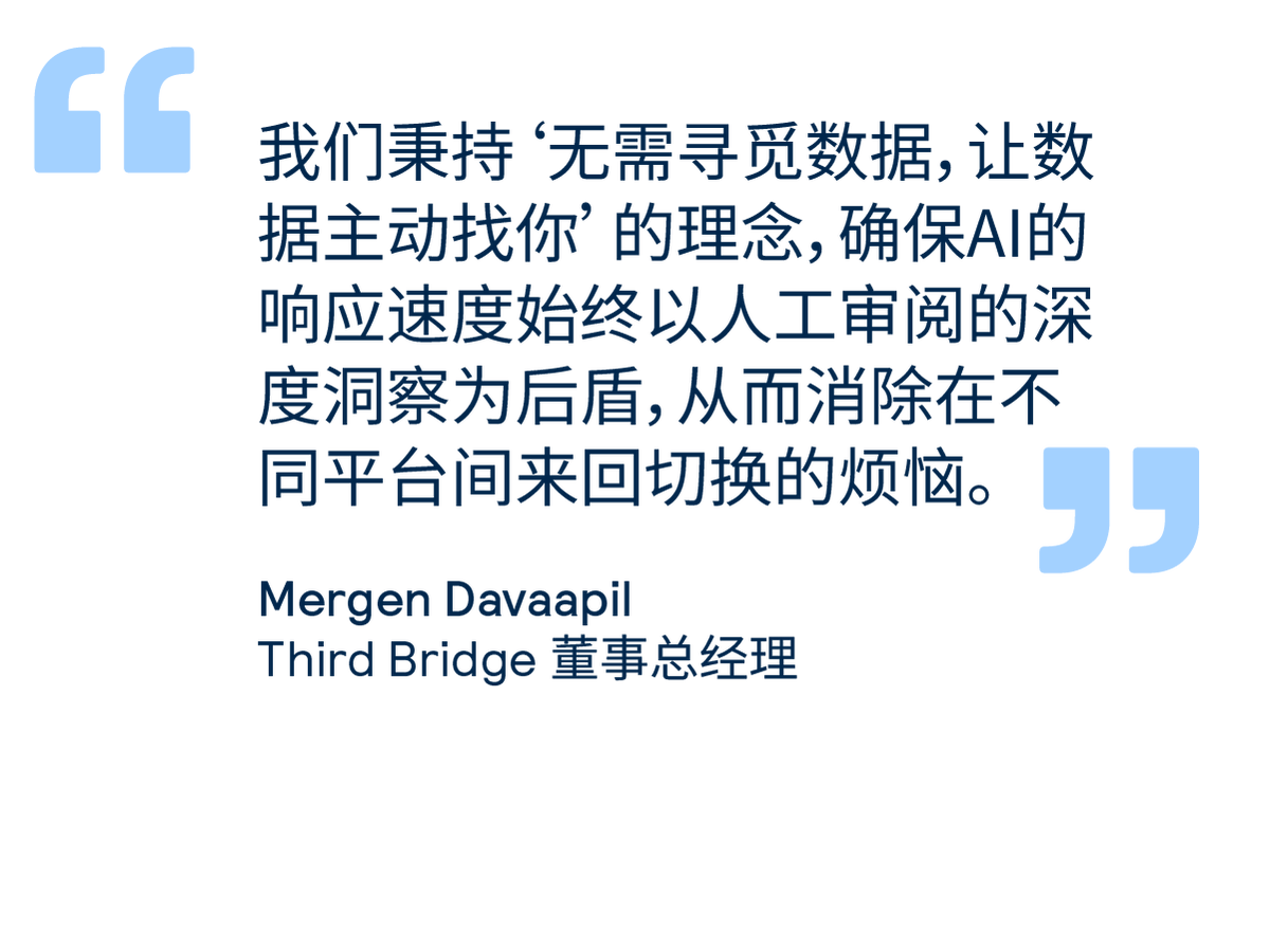 在您日常使用的金融及AI研究平台中,直接获取Third Bridge专家访谈记录,将其深度融入您的每日投研工作流。